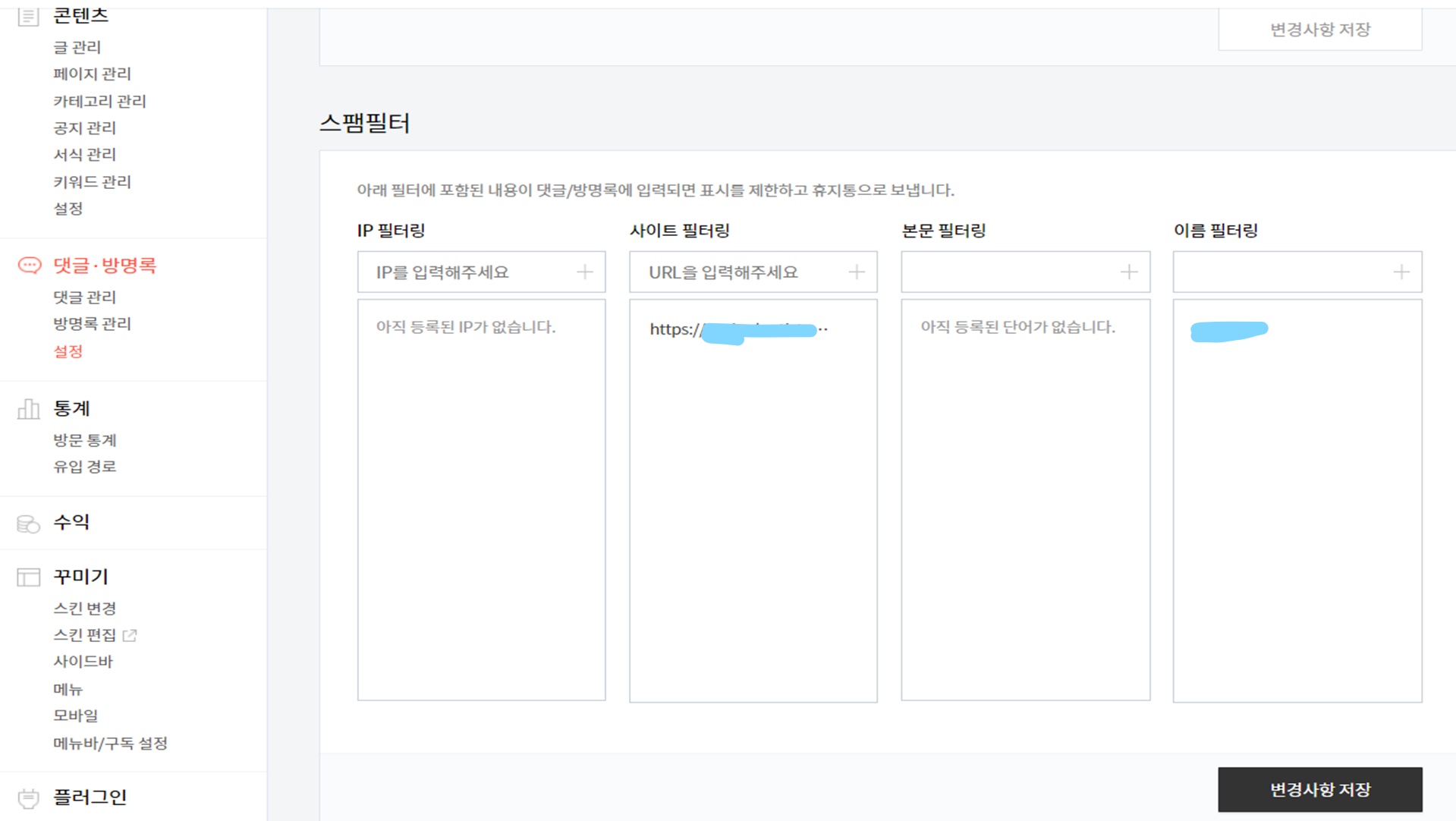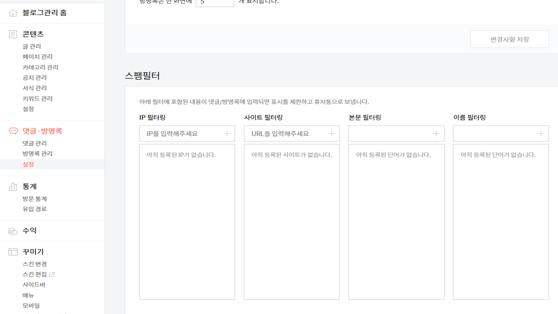 설정에 들어오셔서, 중간 쯤에 있는 댓글방명록 설정을 누르면 스팸필터가 나옵니다.