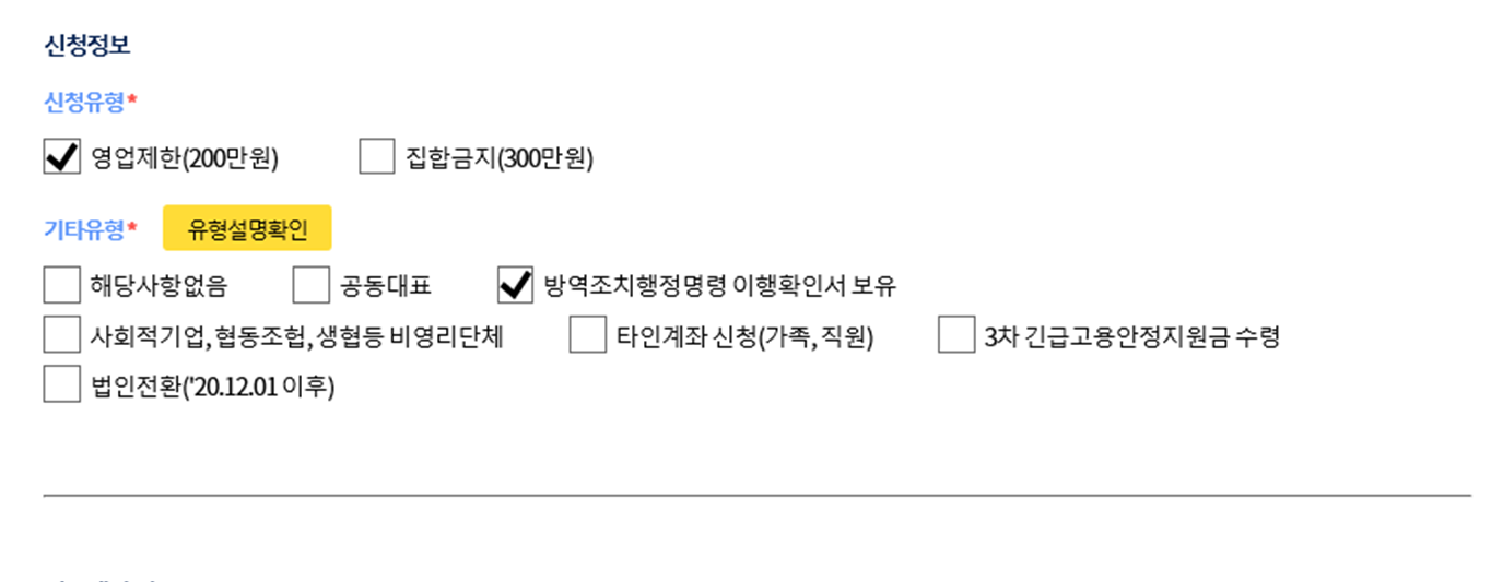 신청유형은 영업제한이고 (집합금지 업종은 집합금지 로 기재),