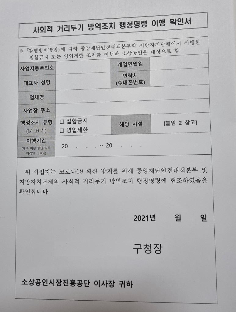 행정명령 이행 확인서는 위와 같은데요. 시군구청에 방문해서 받을 수도 있구요. 일부 지자체의 경우에는 비대면으로도 신청해서 받을 수 있습니다.