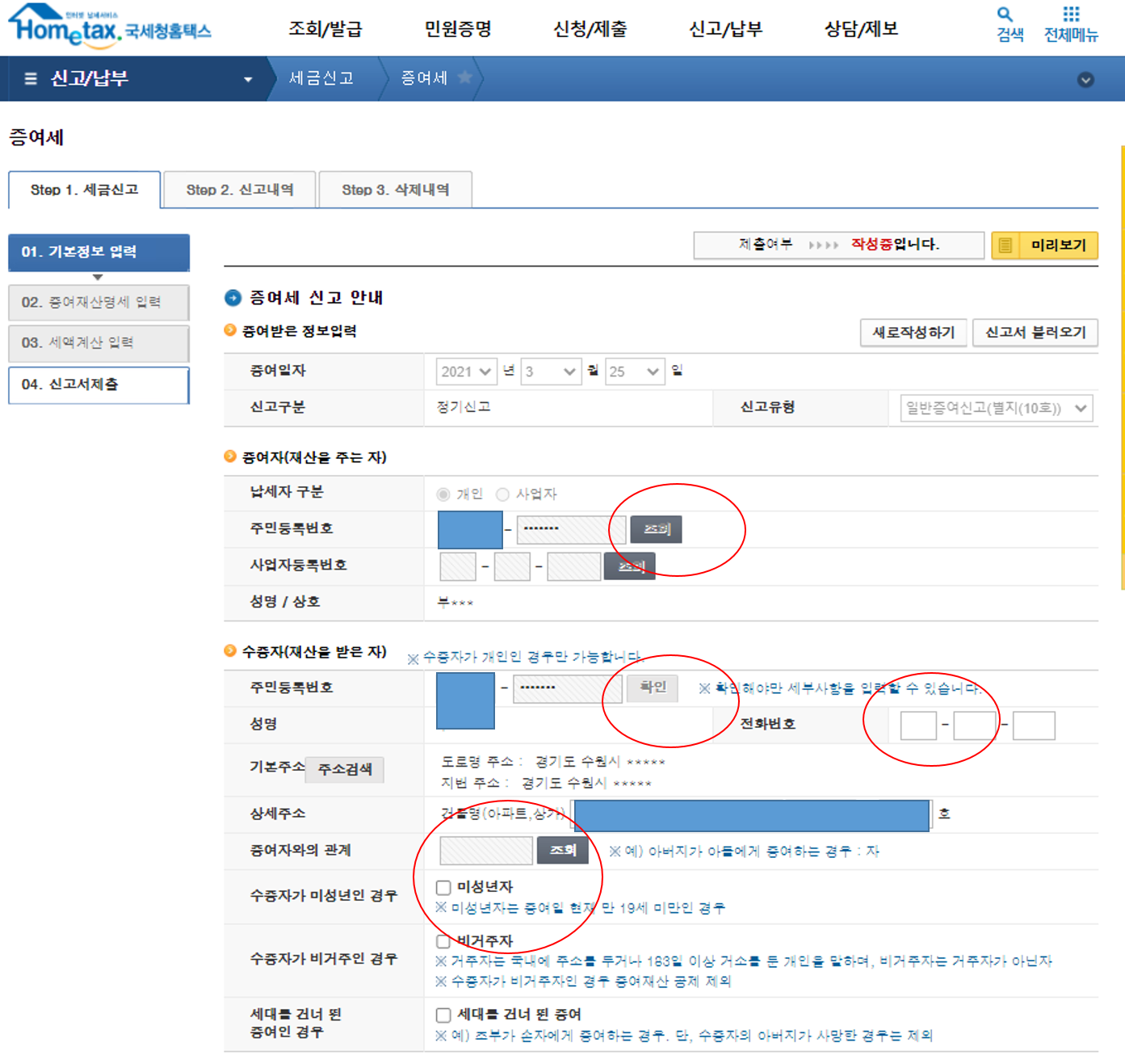 그리고 수증자에서 주민번호는 이미 입력되어 있는데요. 확인 버튼을 누르면 아래의 주소가 자동으로 입력됩니다.