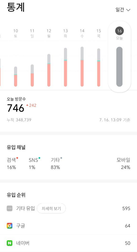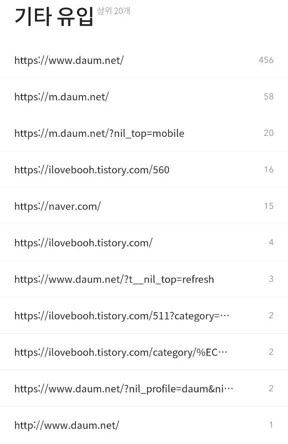 다음 노출이라기에는 너무 소소한데, 아까 1시 정도에 티스토리 모바일에 접속하니, 갑자기 오늘은 각종 유입이 거의 대신 기타유입만 가득.