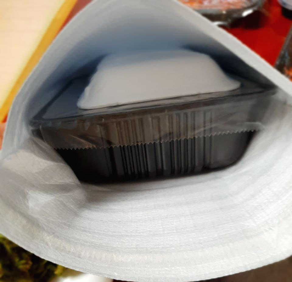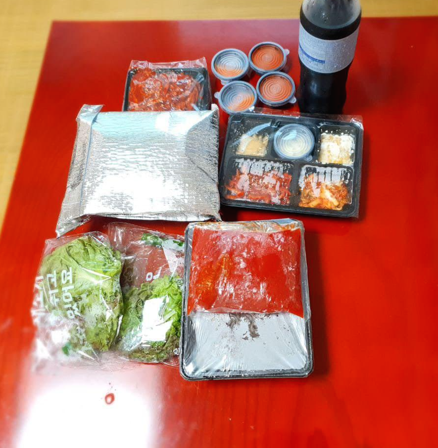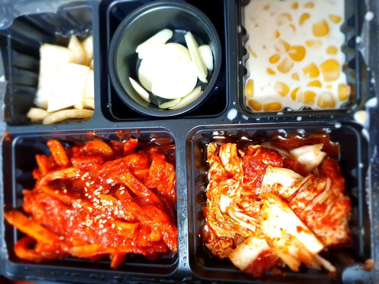이건 반찬을 담아 패키지로 주는데요. 절인 양파, 깐마늘, 콘샐러드, 김치, 그리고 무말랭이 입니다.