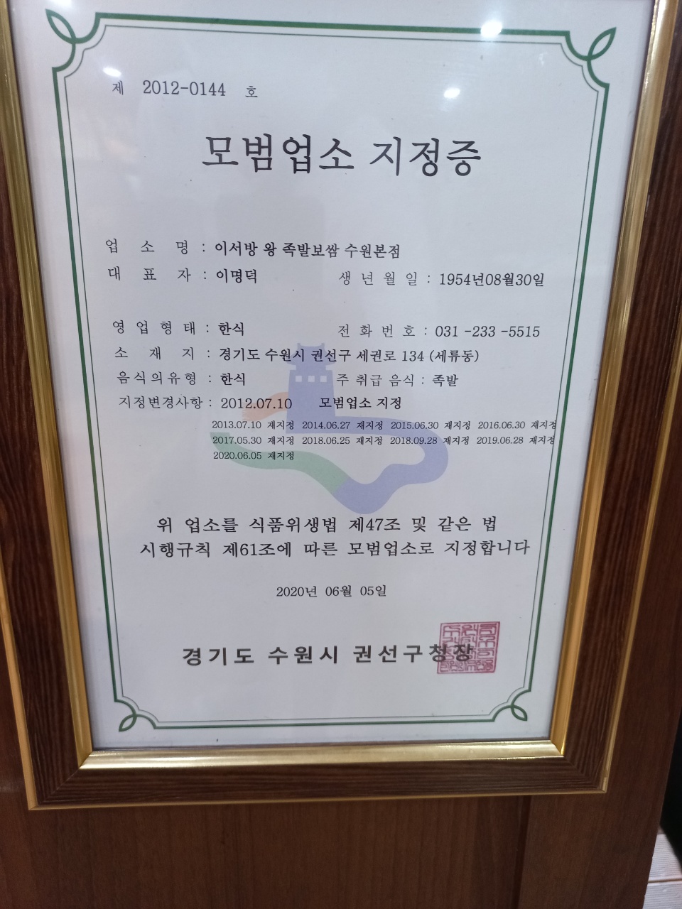 게다가 여기 이서방족발보쌈은 수원맛집답게 이렇게 모범음식점으로 지정도 되어 있었어요.
