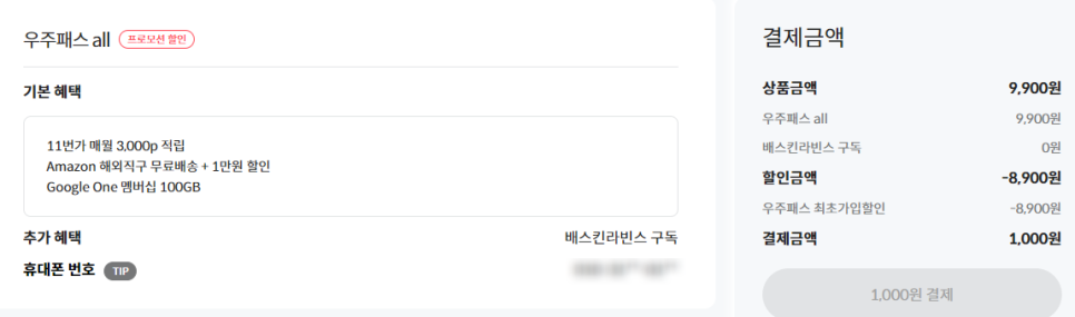 하지만 우주패스 all을 하면 3천포인트 + 배스킨라빈스 7천원 쿠폰이니 오히려 이게 더 싸요.