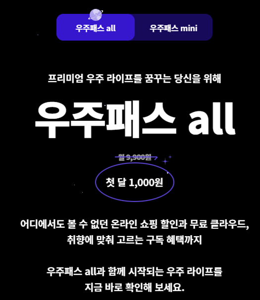 참고로 우주패스 에는 mini 도 있는데요. 첫달에 100원. 그리고 나중에는 4900원 입니다. 물론 3천포인트가 제공되니 실제로는 1900원 이지요.