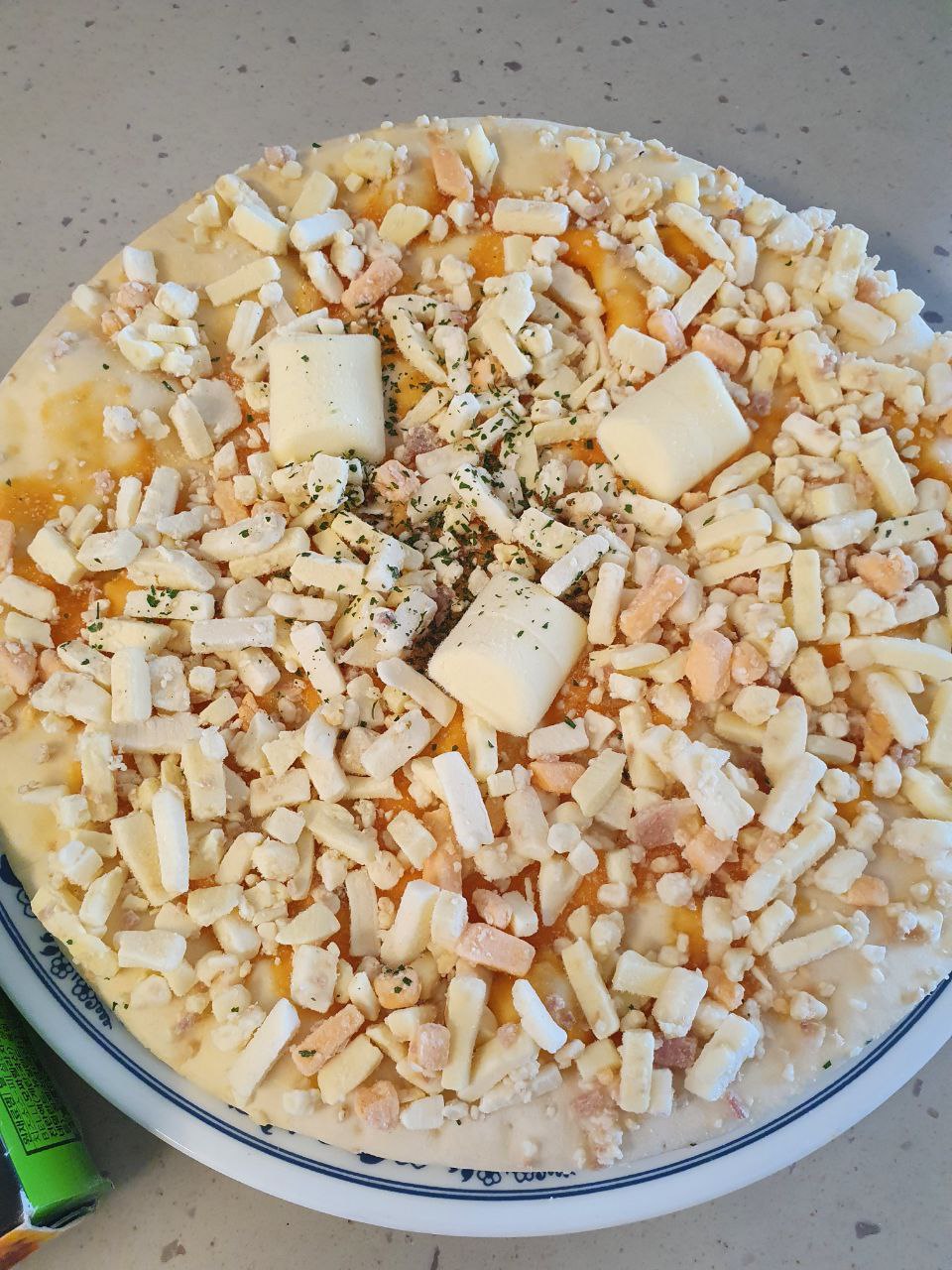 상자를 열어보았습니다. 치즈 토핑이 그득그득 합니다.