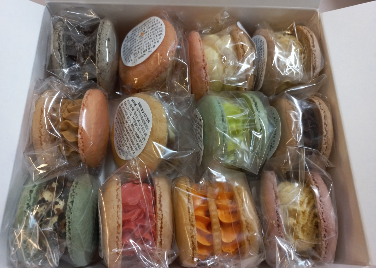 12개의 마카롱이 열을 잘 맞춰서 들어있습니다.