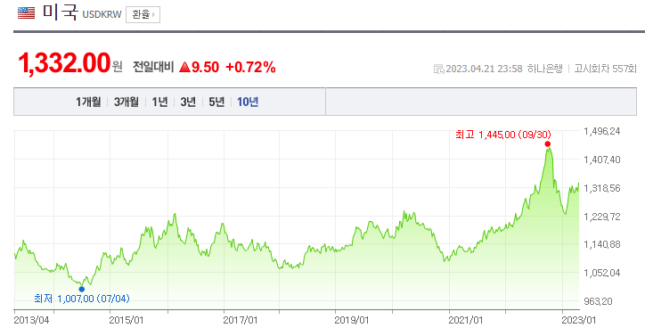 최근 10년간 지난 몇달 전 이후 두번째로 가장 환율이 높은 때이구요.