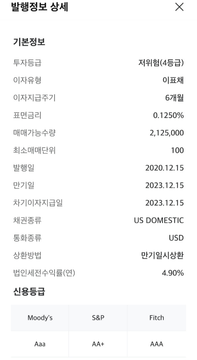 저 채권은 표면금리가 0.125%. 아마 2020년 당시에 제로금리에 가까웠기 때문에 표면금리는 아주 낮군요. 근데 당연한 소리이지만 표면금리가 낮은데 지금처럼 시장의 금리가 올라간다면 채권의 판매 가격은 저렴해지게 됩니다. 표면금리를 높일 수 없기에 거래 가격이 낮아지는거죠.