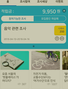 728x90 반응형 엠브레인 추천1 앱테크 두번째 - 엠브레인 패널파워 설문조사를 하면서 소소한 용돈벌이를 할 수 있는 어플인 '엠브레인 패널파워'를 소개합니다. 엠브레인 패널파워는 쉽게 말하면 기업들에서 들어온 설문조사를 패널들이 수행하고, 적립금을 받아가는 형태입니다. 같은 시기에 몇가지 설문조사 앱을 시작해봤는데요. 엠브레인 패널파워만큼 자주 설문이 오고, 적립금이 잘 쌓이는 사이트가 없네요. 그래서 사용기를 올립니다. 4일전의 모습입니다. 3월 15일 정도에 시작했는데, 벌써 9,950원이 되어 있습니다. 엠브레인에는 크게 2가지 조사 방법이 있는데, 첫째는 인터넷 조사, 두번째는 엠브레인 본사에서 진행하는 좌담회가 있습니다. 당연히 좌담회가 돈이 더 되겠지만, 계속 응시해도 좌담회 오라는 소리는 없어서, 마음 편히 인터넷 조사만 하고 있습니다. ^^ 위에 있는 음악.. 2018. 4. 16. 이전 1 다음 728x90 반응형